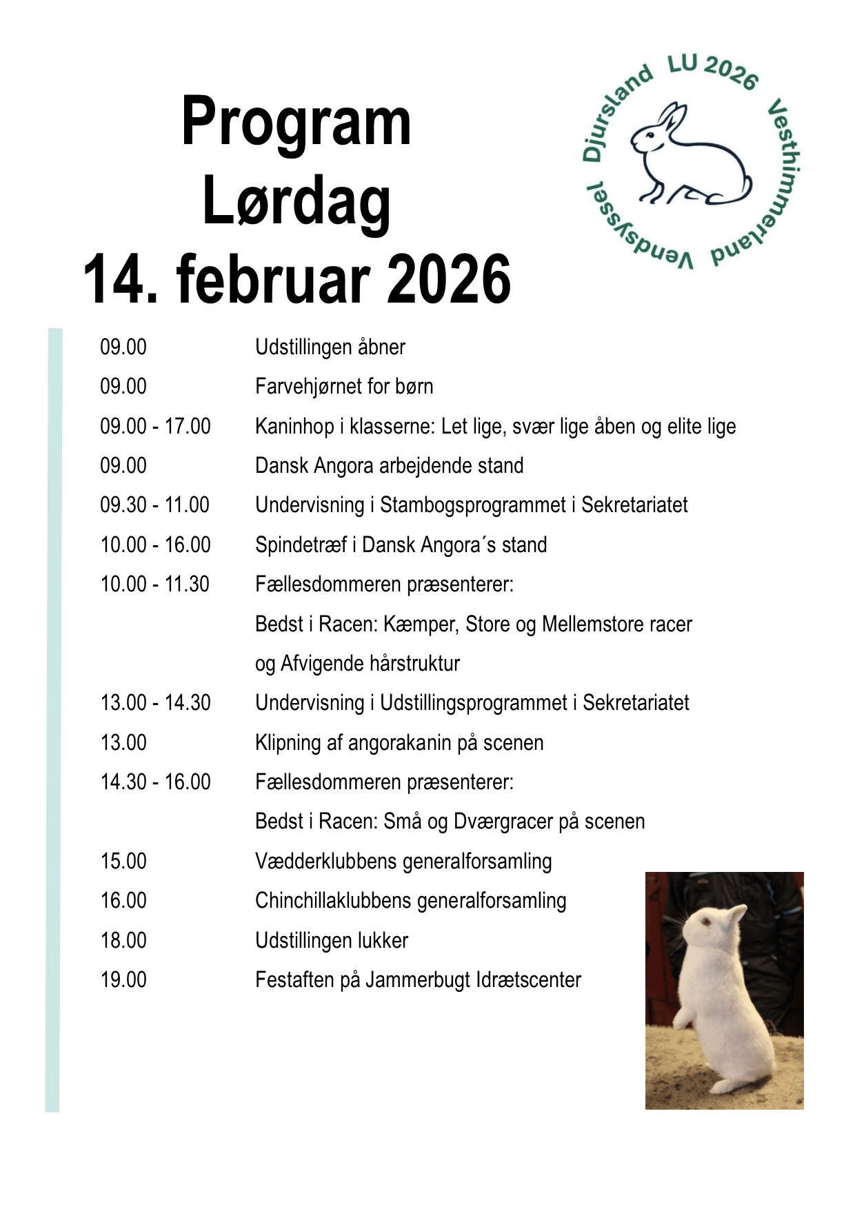 Kaninerne møder torsdag den 12. februar 2026 mellem kl. 16.00 – 21.00. Stampe- og kælekaniner møder senest lørdag den 14 februar 2026 mellem kl. 08.00 – 09.00